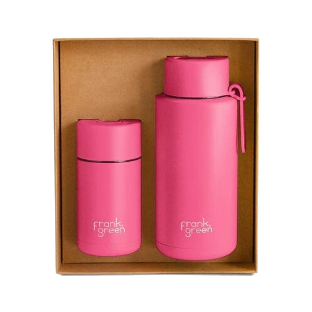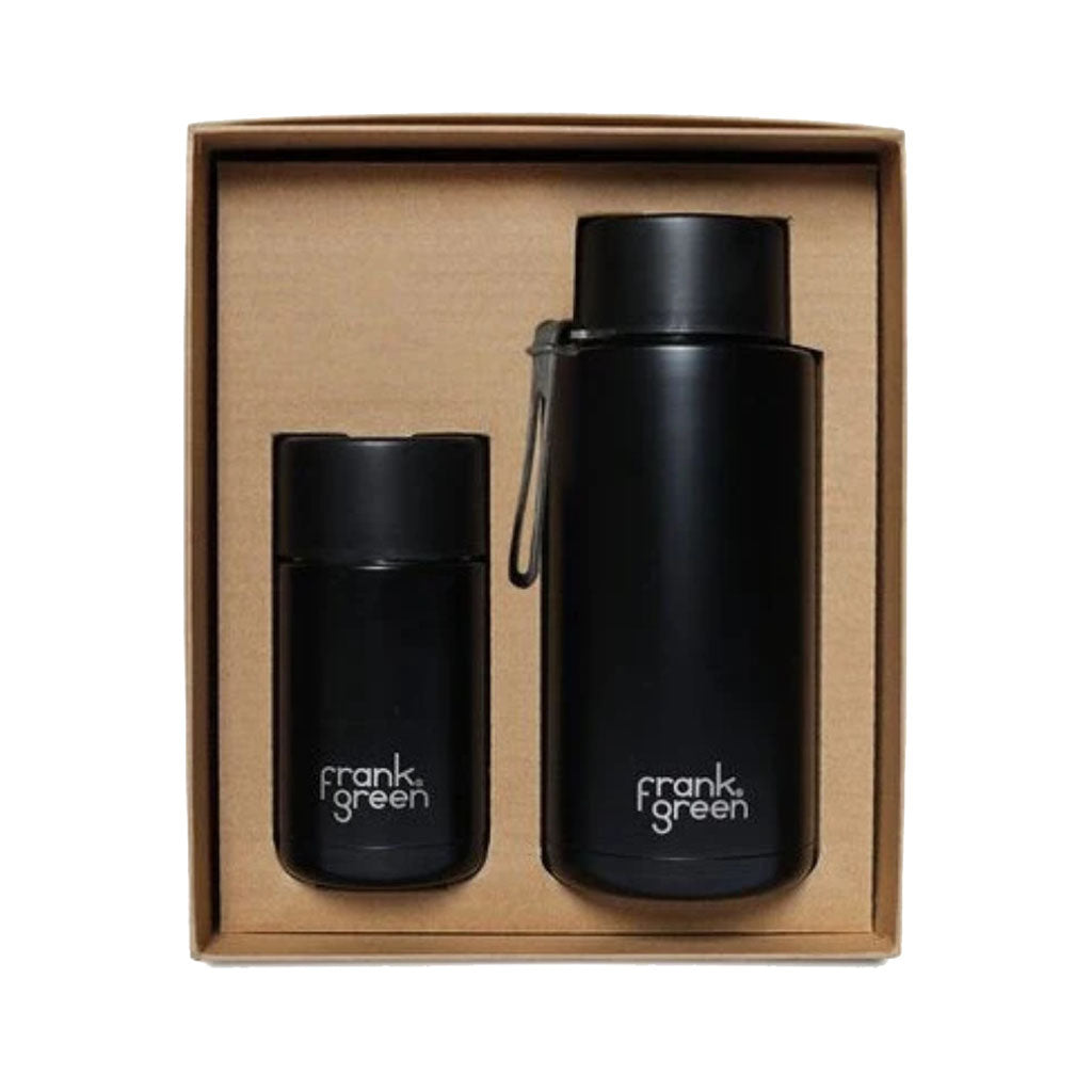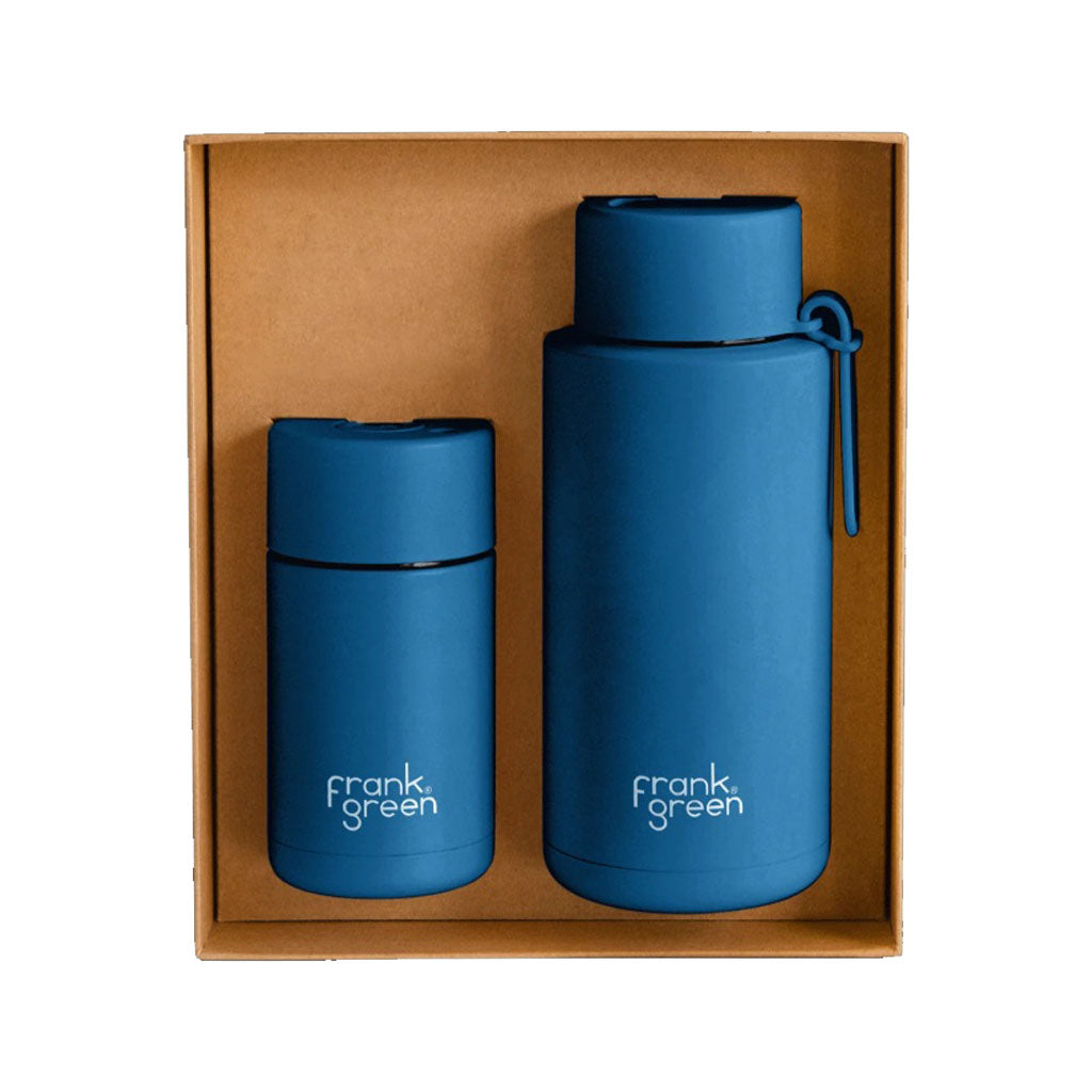 Frank Green gift set including a 12oz/355ml ceramic reusable cup and a 34oz/1,000ml ceramic reusable bottle, packaged in a beautifully-designed planet-friendly gift box.